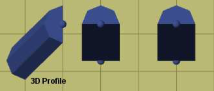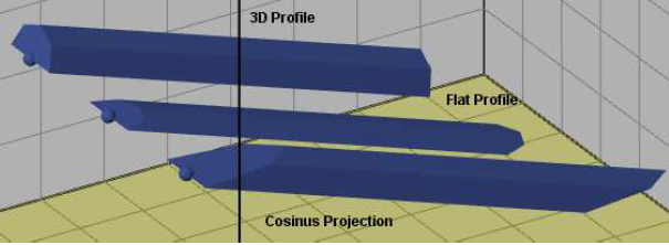 - Cosinus projection: Insert horizontal slice-layers between the nodes of the bar. In contrast to the Flat profile, the profile is still inserted as cross section of the bar. Thus, the slice has the same X-Y-cross section as the profile. However, at its ends, the bar is not cut off in a right angle to its direction and is limited only by the Z-values of its nodes. All slice layers in between are inserted entirely.