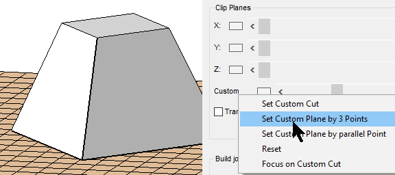 Placing the custom clip planeThe custom clip plane lets you view the cross section of parts at any angle, not just perpendicular to X, Y, or Z.