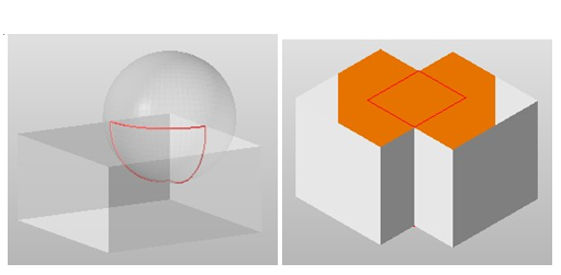 Left: Cutting line of a self-intersection. Right: Triangles belonging to a double surface inside the part are marked in orange.
