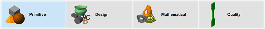TopThis presents you with the part categories. The categories Primitive, Design, Mathematical, and Quality are present by default. A fifth one, Custom, becomes available when once you add your own parts to it, should you so require.