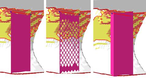 Polyline supports are akin to fences. They support a part along a line that are formed by connecting anchors which are set either manually or generated automatically by cluster detection. Polyline supports may come in three main variants, a thin but otherwise featureless wall, the same again, but with holes to resemble a wire-fence-like structure, and a massive wall with a defined thickness beyond that one of a single toolpass.