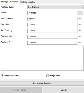 Create packages of small parts to avoid losing them in the build space. The size of the package depends on the outbox size of the various parts. To create the smallest package possible, minimize the outbox size with the