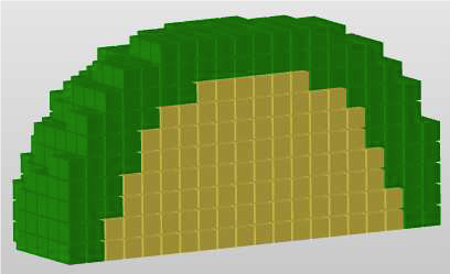 3S The solid part is gridded and fragmented with the 3S Executor. The fragments are groups of grid cells, or voxels, of the gridded part. The voxel resolution of the grid and the fragment sizes and arrangement can be defined differently for every structure. There are various ways to assign different sections of the part to different fragments. After the fragmentation, you can insert different structures or solid cells into the different fragments. The structure cells are multiplied within the fragments and are arranged together to form a connective structure. With this process, the structure is applied to the part.