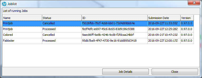 - Joblist: shows a list of the jobs stored on the printer. This button is only enabled if a connection has been established.