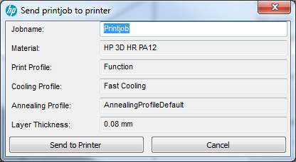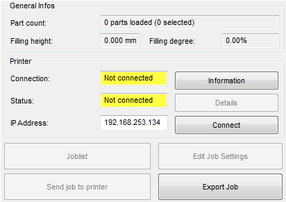 - Edit Job Settings: opens a dialog to configure the settings of a job (Material, Print Profile, Cooling Profile, Annealing Profile). This button is only enabled if a connection has been established