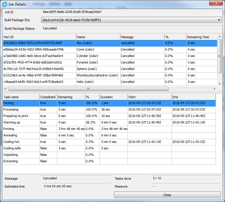 Joblist dialog. It shows the state of all parts of the job in the upper part and the job tasks with their stat in the lower part of the window.
