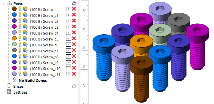 Whenever a new or a replacement part or slice stack enters Netfabb, it gets assigned a color from a rotating color list.