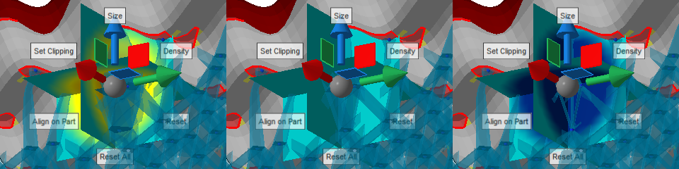 The three panes show a color-coded cross section of the volumetric map at its current location. Teal color represents zero density change, yellow and red an increase, and blue a decrease in density. Shown here is the editor for spherical changes.
