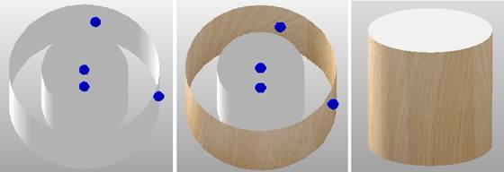 Left: the part with a preview of the texturing plane, middle: a preview