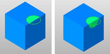 Left: A selection tolerance below 90°. Right: A selection tolerance above 90° and the brush now covers the adjacent side of the box.