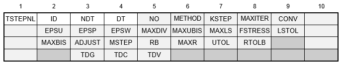1. The TSTEPNL Bulk Data entry must be selected by the Case Control command TSTEPNL = ID. Each solution subcase requires a TSTEPNL command and either applied loads via TLOADi data or initial values from a previous subcase. Multiple subcases are assumed to occur sequentially in time with the initial values of time and displacement conditions of each subcase. Initial conditions specified using the IC Case Control command apply only to the first subcase.