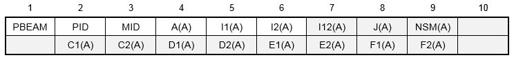 • The second and third continuation entries, which contain fields SO through F2, may be repeated nine more times for intermediate X/XB values for linear beam elements. The order of these continuation pairs is independent of the X/XB value. One value of X/XB must be 1.0, corresponding to end B.