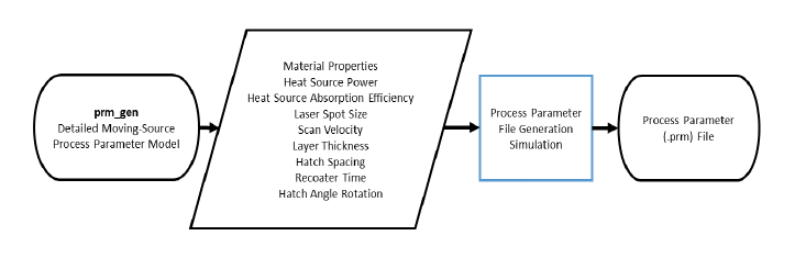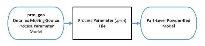 In order to run Part-Level Powder-Bed analysis in Local Simulation, a process parameter (PRM) file must first be generated. The PRM file links the small scale moving-source analysis to the full part-level analysis. This is illustrated in Figure 1 below.