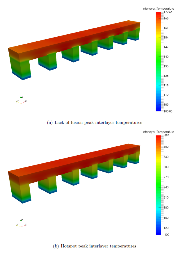Figure 1 shows the peak interlayer temperatures from the two part scale simulations. The temperatures displayed are those after each layer of material is melted and the cool down period has completed. Observe how the hotspot case has much higher temperatures than the lack of fusion case. This will impact both the lack of fusion and hotspot behavior in each simulation, presented later.