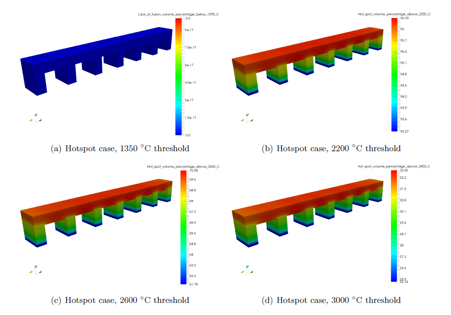 For this case, which intentionally used low heat input processing parameters, there is clear indication of lack of fusion problems. The minimum lack of fusion volume percentage for the 1290° C temperature is 20.3%. This indicates that more than 20% of the deposited volume does not even reach the solidus temperature, indicating there will be significant lack of fusion. The 1350° C check shows that over 28% of the build volume does not fully melt. This could cause lack of adhesion or build failure early on in the production of this part. Overheating is not an issue with this set of processing conditions, as a negligible portion of the build volume exceeds 2200° C, and none of the part reaches 2600° C.