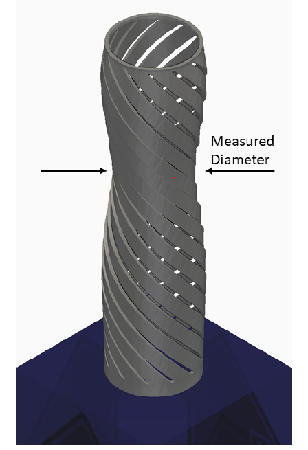 To perform the measurement, use the calipers to determine the diameter at the ’waist’ of the cylinder where the peak displacement occurs. Subtract from the manufactured diameter the nominal width of the test part (12.7mm) and divide by 2 to get the distortion of the printed part: