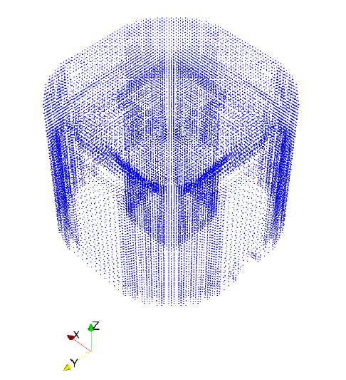 Two point cloud files are produced during the mechanical simulation: 03_mechanical_1.wrtu and 03_mechanical_2.wrtu, which are from the increments right before and after removal of the part from the build plate, respectively, for the nodes of the built component. These files have the format X, Y, Z, X displacement, Y displacement, Z displacement with all the units in mm. A visualization of the X,Y,Z point cloud is shown in Figure 3.