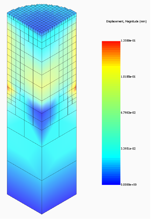 Results can be imported and viewed in ParaView or the Simulation Utility for Netfabb. Figure 2 shows the computed final distortion after substrate release. Observe the 0 displacement at the origin, showing the effect of the symmetry conditions.