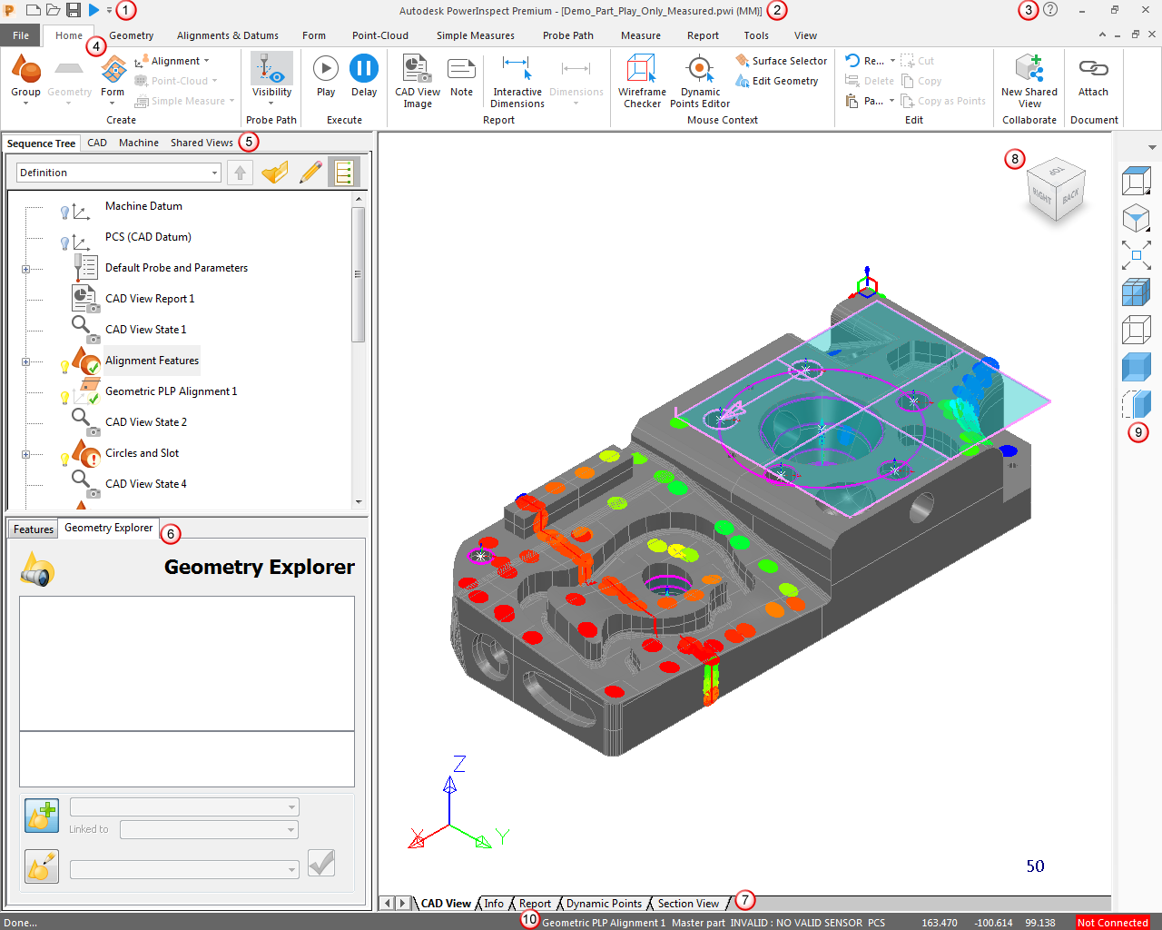 When you have selected the CAD model you want to work with, it is displayed in the PowerInspect screen, with the tabs you need to create, run, and manage an inspection. For example: