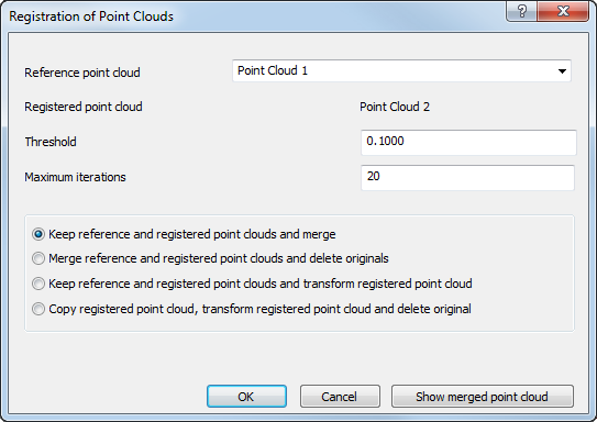 - Keep reference and registered point-clouds and merge to leave the original point-clouds unchanged, and create a new point-cloud that contains the points of both originals.