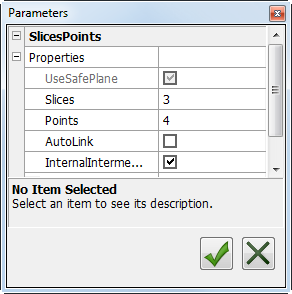 Each probing method contains several parameters that determine the number of probed points required to measure an item, the number of slices in the probe path and so on. Use the Parameters dialog to view or change the default values for the currently selected method.
