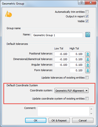 Alternatively, you can specify a default alignment for all items added to a geometric group by opening the group dialog, and selecting an alignment in the Coordinate System list. To apply the selected coordinate system to items already in the group, select the Update coordinate system of existing entities check box.: