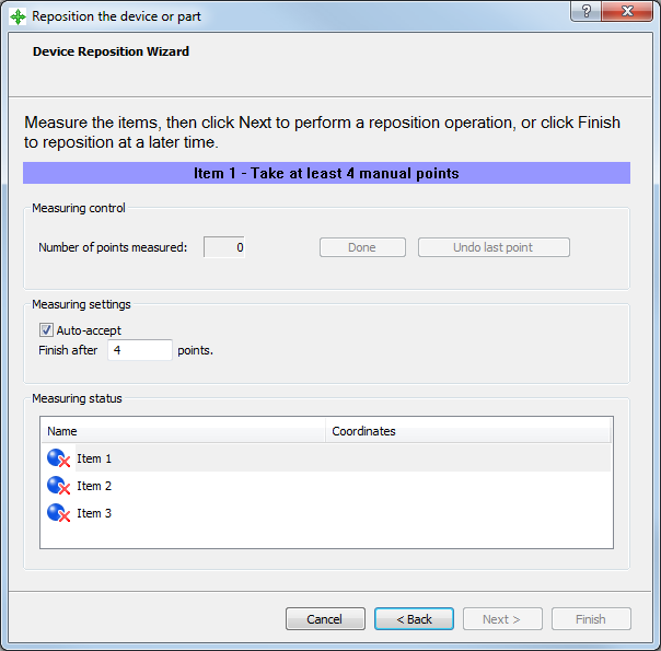 When you reposition a part or device, PowerInspect matches measurements taken before and after the move, and uses them to create a transformation. This transformation is automatically applied to all measurements made after the repositioning, and enables you to continue the inspection in the original coordinate system.