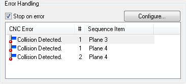 The Error handling list contains the errors identified by PowerInspect. Each entry specifies the type of error, the number of errors in the move, and the sequence item in which the error occurred. For example:
