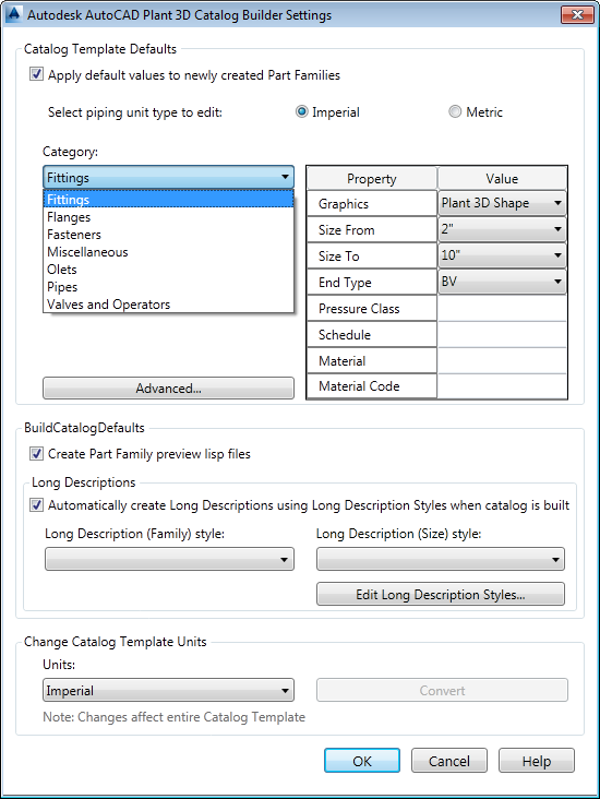Specifies default values for a component category. You can specify a default graphic type, size range, end type, pressure class, and schedule. The defaults are used when you create a part family.