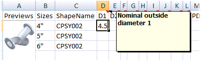 In the worksheet, you provide detail for part sizes. The Excel worksheet then contains all of the data necessary to create or add to a PCAT catalog. The CTPL catalog template is no longer required after export.
