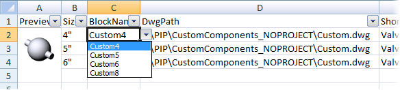 For block-based components, you can choose from a list block names. The list matches the block names that are available in the DwgPath drawing and cannot be modified after the XLS file is created.