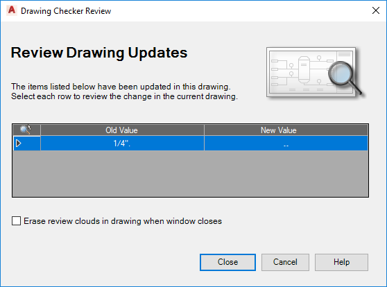 The table displays discrepancies in text or annotation values found by the drawing checker. Selecting a row zooms to updated text in the current drawing, shown within a review cloud.