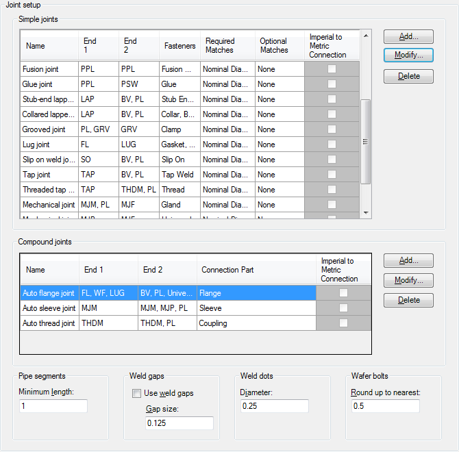 Sets up simple and compound joint types. Also sets minimum pipe segment length, connector display settings, and bolt rounding factors.
