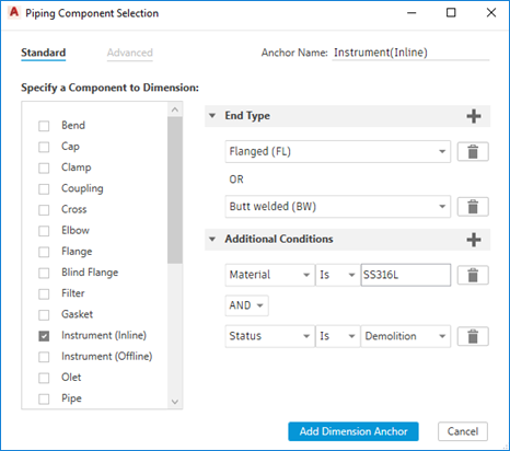 Adds one or more objects to dimension anchors or exclusions. You can specify one or more end types to limit dimensioning to a component of a specific end type (for example, flanged valve). Apply conditions to piping components with a specific status, service, or other conditions.