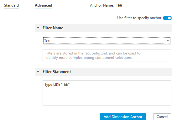 Allows filtering to specify anchor to select any existing filter as the dimension anchor or exclusion. Filters are stored in the IsoConfig.xml and can be used to identify more complex piping components selections.