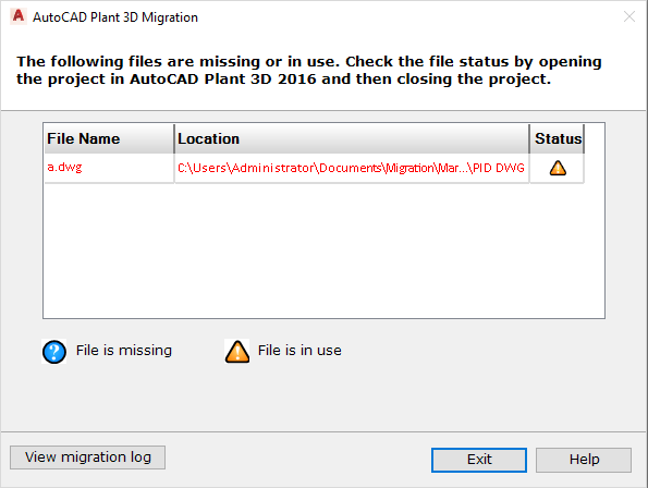 In order to migrate a project successfully, AutoCAD Plant 3D toolset must be able to place an exclusive lock on all files related to the project. The File Unavailable page is displayed if a file related to the project is missing, or if a file is currently in use. For example, you moved a drawing or deleted a file from the project folder, or someone is editing a drawing using AutoCAD P&ID 2009.