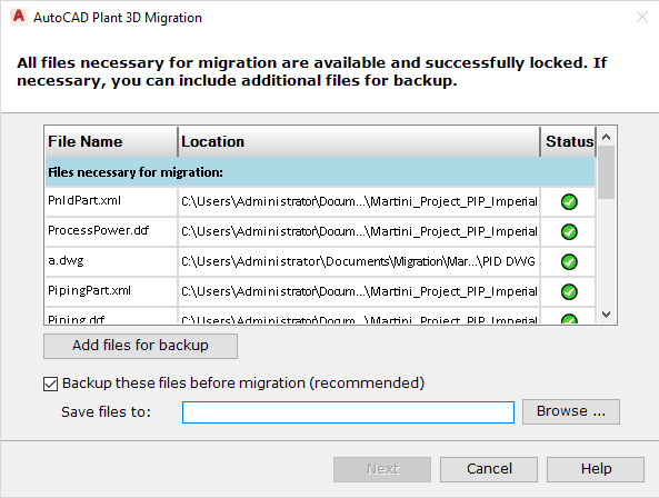 The system searches for all files necessary for a successful migration of the AutoCAD P&ID 2009 project. The table dynamically displays the name, location path, and status of each file. indicates a successfully locked file, and