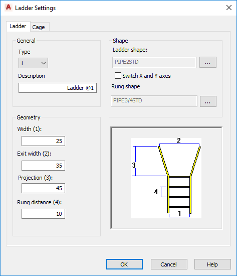 Edits the geometry settings for the selected ladder. Numerical values indicated in parentheses correspond to the labeled geometry in the preview image.