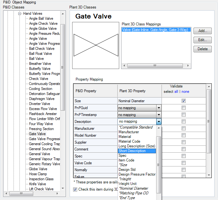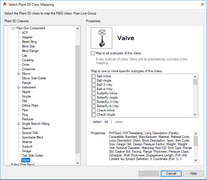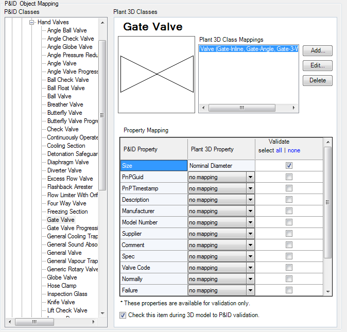 Under Plant 3D Classes, in the Plant 3D Class Mappings list, click the current mapping (for example: Valve Gate-Inline, Gate-Angle, Gate-3-Way).