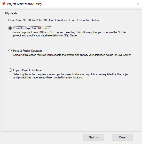 Click Next to display the Project Maintenance Utility - Convert a Project to SQL Express dialog box.