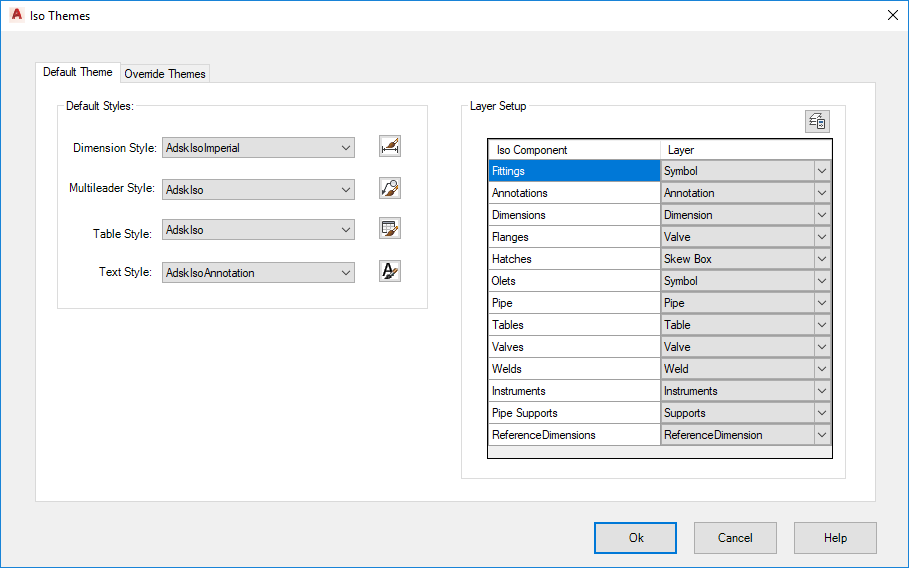 Configures the default theme for the isometric title block, including dimension, multileader, table, and text styles, layer assignments, and the inclusion or exclusion of dimensions and annotations.