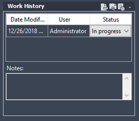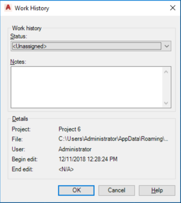 You can also enter status and notes in the Work History dialog box, if your project administrator has configured the dialog to display when you open or close a drawing. Note that this is not a mechanism for storing, retrieving, or controlling versions of a drawing.