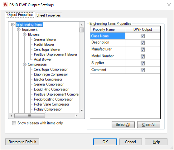 By default, all the properties of the Engineering Items and Non-Engineering Items trees are included.