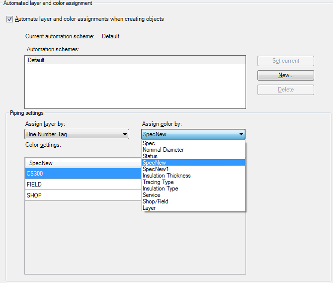 Layer and Color Settings (Plant 3D DWG Settings Tree Node)