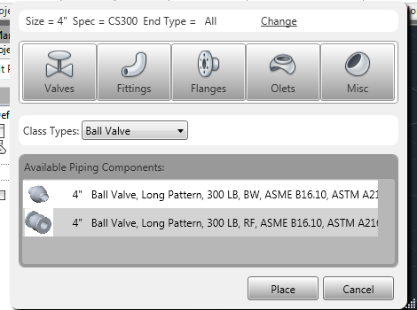 In Available Piping Components, click component (for example, Ball Valve, Long Pattern, 300LB, RF).