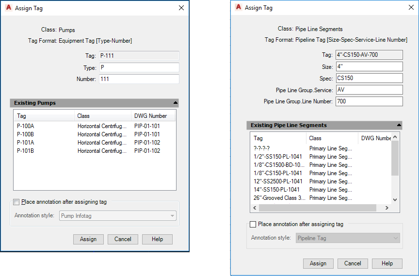 Each class contains different types of tag fields. The dialog box for Pipe Line Segments, for example, has the fields Tag, Size, Spec, PipeLineGroup.Service, and PipeLineGroup.LineNumber.