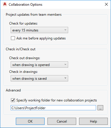 Time interval: Checks the server to download files and project information that have been updated by team members at the specified interval in the combo box. By default, the project is updated automatically at the specified interval.