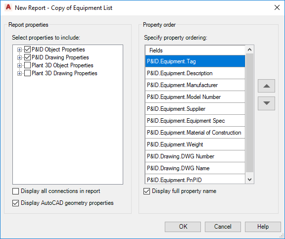 If you are creating a Plant 3D report template, you can specify Plant 3D object or drawing properties and order them appropriately. The Plant 3D data is included in the report only if a corresponding P&ID object with an identical tag exists in the project.