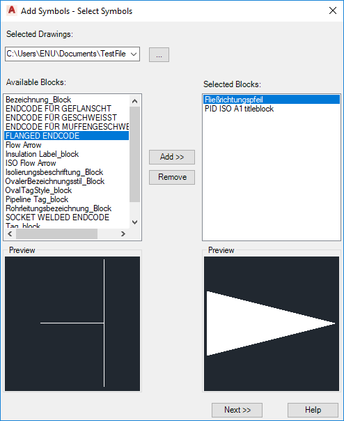 - Use the Selected Drawings drop-down list to select each file in turn. A list of the blocks in each file display in the Available Blocks box.