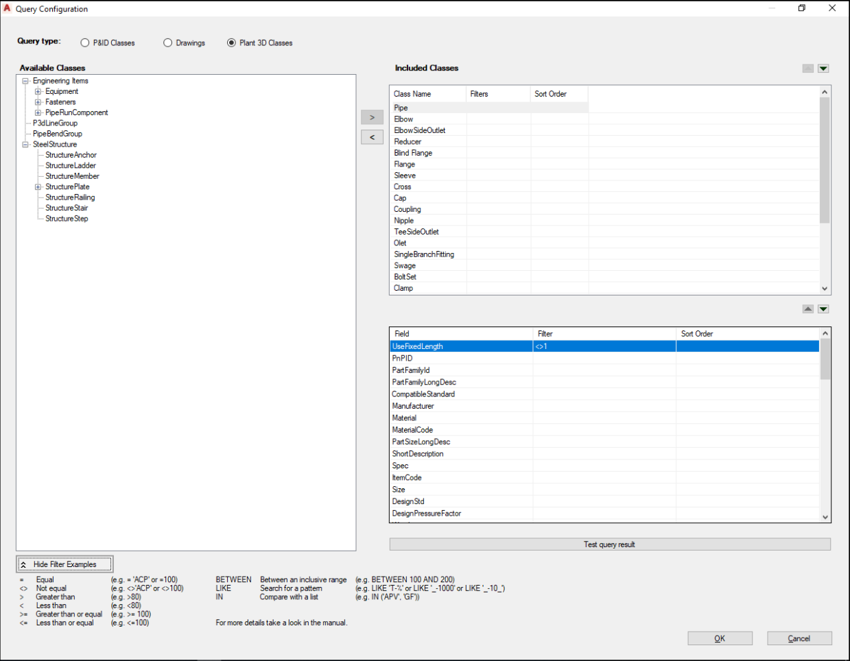 - For Query Type, click P&ID Classes, Drawings, or Plant 3D Classes.